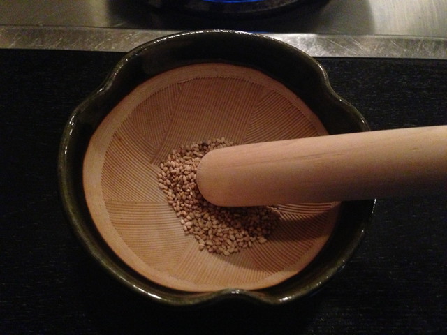 先ほど、ごまを擦ったすり鉢に具材を入れて食べます。
